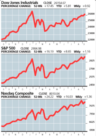 스탠더드앤푸어스(S&P) 500지수는 전주보다 1.16% 상승한 2904.98포인트에 마감했다. 기술주 중심의 나스닥 지수는 1.36% 상승한 8010.04포인트에, 다우존스 30 산업평균지수는 0.92% 오른 2만6154.67포인트에 장을 마쳤다. 이로써 다우존스산업평균지수는 지난 2월 1일 이후 가장 높은 종가를 기록했다.