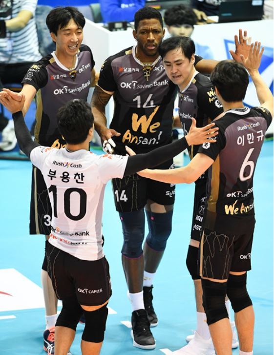 | OK 저축은행이 요스바니(가운데)의 활약 등으로 프로배구 2위로 뛰어 올랐다.[사진= KOVO] |