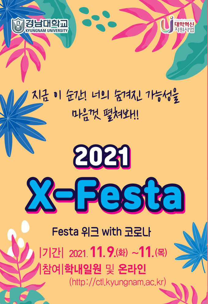이번 행사는 정부의 단계적 일상회복인 위드 코로나 시행에 맞춰 코로나19를 경험한 학생들이 보다 즐겁고 역동적으로 대학생활을 즐길 수 있게 전공, 힐링, 건강, 게임, 특강, 대회 등 6개 영역, 70여 개의 다채로운 온·오프라인 프로그램으로 구성된다.