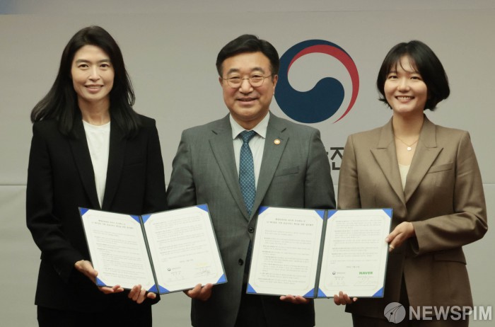 [서울=뉴스핌] 이길동 기자 = 윤호중 행정안전부 장관(가운데)이 27일 서울 종로구 정부서울청사에서 열린 AI 에이전트 기반 공공서비스 혁신 업무협약식에서 협약서 서명후 네이버 최수연 대표(오른쪽), 카카오 정신아 대표와 기념촬영 하고 있다. 2025.10.27gdlee@newspim.com