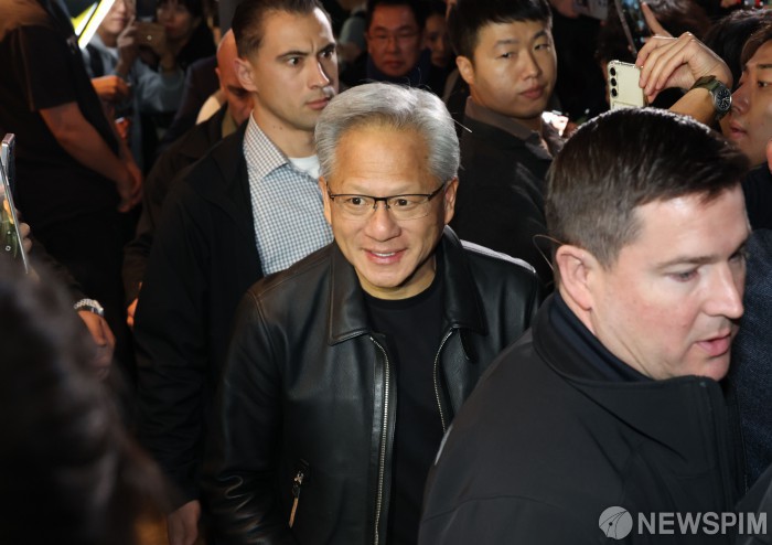 [서울=뉴스핌] 최지환 기자 = 젠슨 황 엔비디아 최고경영자(CEO)가 30일 오후 서울 강남구 삼성역 인근 깐부치킨 매장에 이재용 삼성그룹 회장, 정의선 현대차그룹 회장과 함께 들어서고 있다. 2025.10.30 choipix16@newspim.com