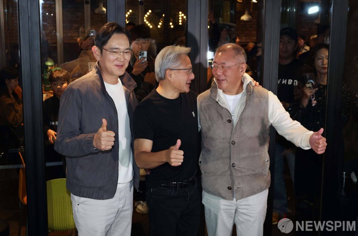 [서울=뉴스핌] 최지환 기자 = 이재용(왼쪽부터) 삼성전자 회장, 젠슨 황 엔비디아 최고경영자(CEO), 정의선 현대차그룹 회장이 30일 서울 강남구 삼성동의 한 치킨집에서 회동을 마친 뒤 기념촬영을 하고 있다. 2025.10.30 choipix16@newspim.com