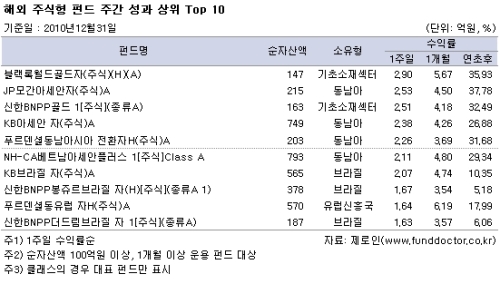 동남아주식펀드와 남미신흥주식펀드는 우수한 성과를 거뒀지만 중국주식펀드와 아시아신흥주식펀드는 마이너스였다.