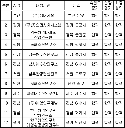 국토부는 해양환경 측정․분석 자료의 품질관리(QA/QC)를 위해서 지난해 7월부터 해양환경 조사기관을 대상으로 측정․분석 능력 인증 평가를 실시했으며, 이를 통해 16개 기관(업체) 중 12개 기관을 적합으로 판정했다고 설명했다.