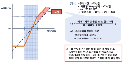 즉, 자문형 랩의 성과가 주식시장 하락을 초과 하락한 경우 자문형 랩의 성과와 고정된 옵션손실이 함께 발생한다. 반면 강세장에서 성과가 일정한 범위를 초과한 경우 애초 레버리지 구간에서 확보한 '알파'의 수익률이 더해지는 것이다.