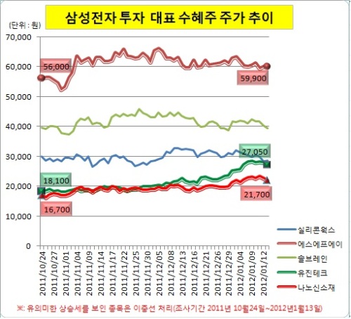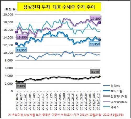 각 협력사들이 여러 증권사들과 언론매체로부터 수혜 기업으로 꼽혔으나 주가 흐름은 달랐던 것.