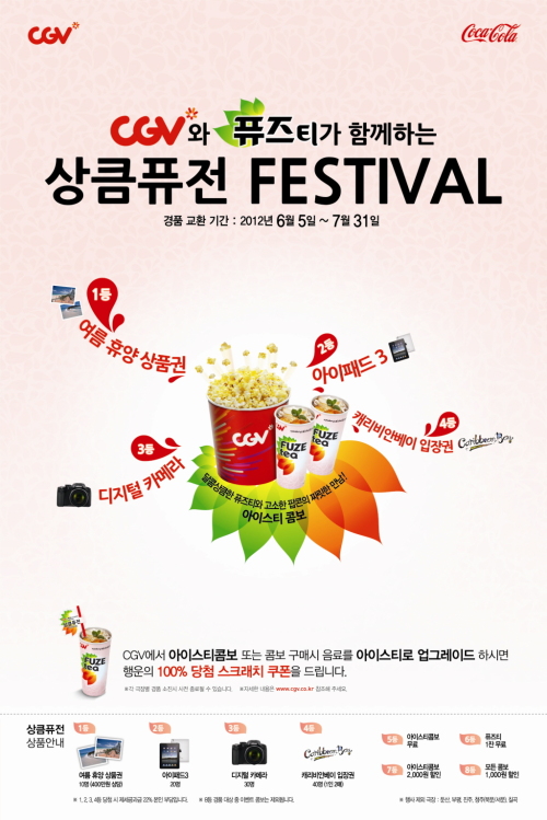 이번 ‘상큼 퓨전 페스티벌’은 CGV에서 아이스티 콤보를 구입하거나 콤보 구입시 음료를 퓨즈 티(아이스티)로 업그레이드하는 모든 고객들을 대상으로 펼쳐진다.