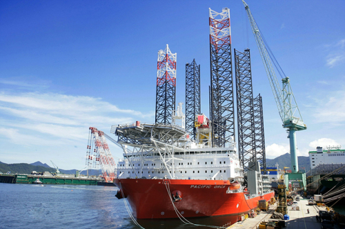 -출항을 준비하고 있는 세계 최대 해상풍력발전기 설치선 'PACIFIC ORCA'호 <삼성중공업 제공>