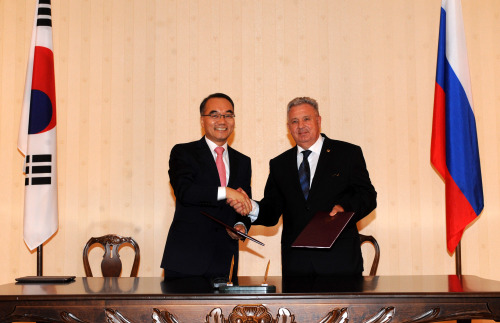 | APEC재무장관회의 참석차 러시아 모스코바를 방문중인 박재완 기획재정부 장관이 28일 오후(현지시간) 프레지턴트 호텔에서 열린 '제12차 한-러 경제과학기술공동위원회'에 참석, 회의를 마친 후 합의의사록에 서명 후 악수를 나누고 있다. |