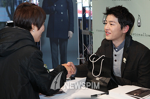 [뉴스핌=최진석 기자] 배우 송중기가 16일 오후 서울 마포구 서교동 홍대 커스텀멜로우 H 스토어에서 열린 커스텀멜로우 도네이션 프로젝트 'GOOD SHOPPER GOOD MAN' 재능기부 사인회에 참석해 한 팬에게 선물을 받고 악수를 하고 있다.