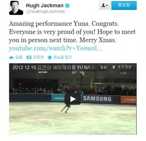 휴 잭맨은 지난 10일 오후(현지시간) 자신의 트위터에 "놀라운 연기였어요 연아! 축하합니다. 모두가 당신을 자랑스러워합니다. 다음에 직접 만날 기회가 있기를 바랍니다. 메리크리스마스 (Amazing performance Yuna. Congrats. Everyone is very proud of you! Hope to meet you in person next time. Merry Xmas)"라는 축하의 메시지와 함께 영상을 게재했다.