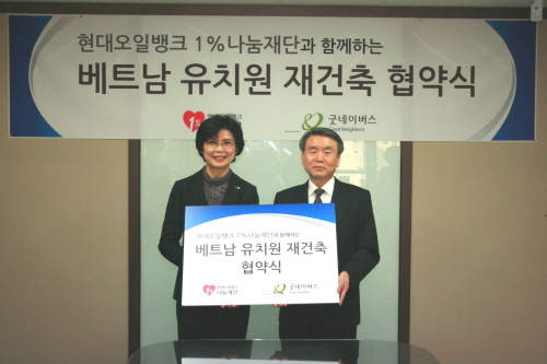 현대오일뱅크 1%나눔재단은 14일 국제구호개발 단체 굿네이버스와 협약을 맺고 해외 오지 학교건립 사업에 참여하기로 했다.