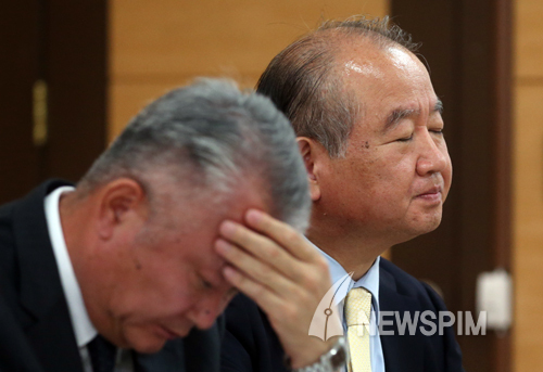 [뉴스핌=김학선 기자] 남양유업 김웅 대표이사(오른쪽)와 곽주영 영업총괄본부장이 5일 오후 서울 인사동 태화빌딩 회의실에서 열린 남양유업전국대리점협의회와의 1차 협상에서 굳은 표정을 짓고 있다.
