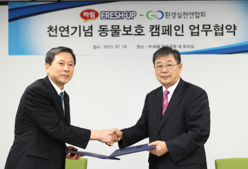 [뉴스핌=이연춘 기자] 하림(대표 이문용)의 프리미엄 브랜드 프레쉬업은 지난18일 환경실천연합회와 천연기념 동물 보호 캠페인을 후원하는 업무 협약식을 체결했다.