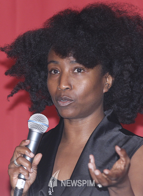 [뉴스핌=강소연 기자] 제작자 나넷 남스가 3일 오후 부산 해운대구 영화의전당 중극장에서 열린 제18회 부산국제영화제(BIFF) 개막작 '바라:축복' 기자회견에 참석해 질의응답을 하고 있다.