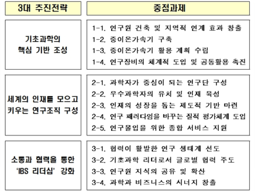 3대 추진전략은 기초과학의 핵심 기반 조성, 세계의 인재를 모으고 키우는 연구조직 구성, 소통과 협력을 통한 IBS 리더십 강화 등이다.