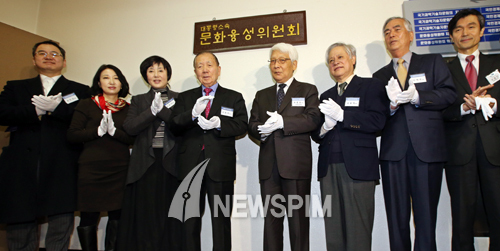 [뉴스핌=김학선 기자] 19일 서울 광화문 KT 사옥 내 문화융성위원회에서 김동호 위원장(왼쪽 네번째)을 비롯한 내빈들이 대통령소속 문화융성위원회 현판식을 진행하고 있다.