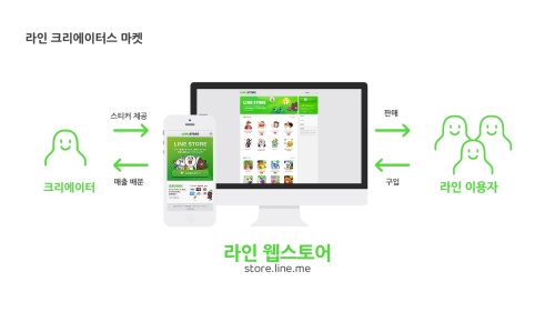 라인 크리에이터 마켓은 라인 가입자 누구라도 직접 제작한 스티커를 라인 웹스토어를 통해 판매할 수 있은 플랫폼이다. 스티커 등록과 신청은 무료이며 40종류의 스티커를 하나의 패키지로 묶어 100엔(1000원)에 판매하는 방식이다. 수익의 절반은 스티커 제작자에게 돌아간다.