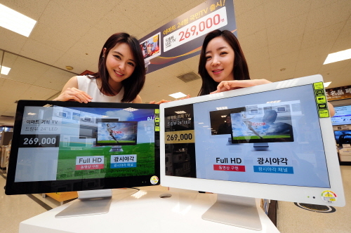 사진은 이날 오전 서울 성동구 이마트 성수점 가전매장에서 도우미들이 새 TV제품을 선보이는 모습. 24형 드림뷰 TV는 블랙과 화이트 두가지 색상이며, 가격은 26만9000원으로 동일 사양 유명 브랜드 LED TV 30% 가량 저렴하다.