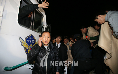 [뉴스핌=김학선 기자] 인천에서 출발해 제주로 향하던 여객선이 전남 진도군 관매도 인근 해상에서 침몰한 가운데 17일 새벽 진도 팽목항에서 실종자 가족들이 사고해역으로 가는 해경 함정에 오르고 있다.