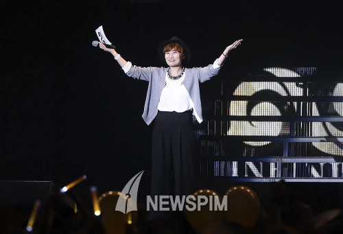 [뉴스핌=강소연 기자] 방송인 박경림이 21일 오후 서울 잠실학생체육관에서 열린 '인피니트 1.2.3 쇼케이스'에 참석해 인사를 하고 있다.