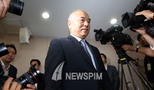 [뉴스핌=김학선 기자] 문창극 국무총리 후보자가 24일 오전 서울 세종로 정부서울청사에서 긴급 사퇴 기자회견을 하기 위해 브리핑룸에 들어서고 있다.