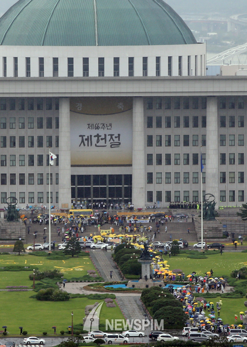 [뉴스핌=김학선 기자] 세월호 참사 100일째인 24일 오후 세월호 특별법 제정을 촉구하며 행진 중인 세월호 참사 가족대책위와 시민 사회단체 등이 국회에 도착하고 있다.
