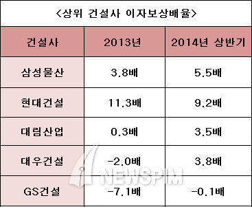 올해 시공능력순위 1위로 올라선 삼성물산(상사부문 포함)은 지난해 이자보상배율이 3.8배에서 올 상반기에는 5.5배로 상승했다.