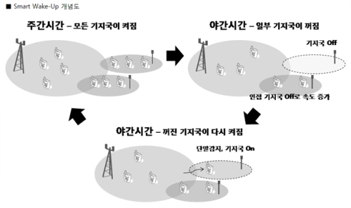 ‘스마트웨이크업’ 기술이란 야간이나 새벽시간에 이용되지 않고 있는 불필요한 기지국의 활동을 제어하는 것이다.