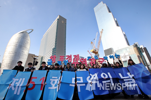 [뉴스핌=김학선 기자] 한국무역협회 및 코엑스 직원과 대학생 무역홍보대사들이 '제51회 무역의 날'을 하루 앞둔 4일 서울 강남구 삼성동 무역센터 1조 달러 탑 앞에서 4년연속 무역1조달러 달성을 기념해 '창조경제로 도약하는 글로벌 무역강국' 슬로건 카드를 들고 퍼포먼스를 펼치고 있다.