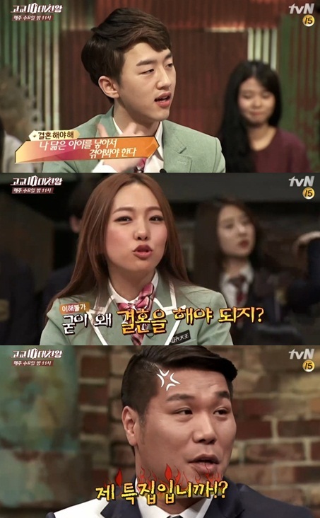 더불어 결혼은 안해도 동거는 허용한다는 10대들의 혼전 동거에 대한 생각도 전해진다. 최근 진행된 '고교10대천왕' 녹화에서 10대들은 결혼에 대한 생각을 거침없이 표했다. 이에 MC들이 오히려 "너희 이렇게 이야기해도 괜찮니"라며 당황했다는 후문이다.