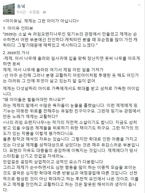 | 아이유의 신곡 '제제'에 대해 '나의 라임 오렌지나무'를 번역출간한 동녘이 올린 글 <사진=출판사 '동녘' 페이스북> |