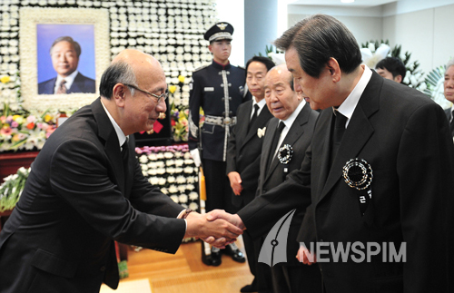 [사진공동취재단] 벳쇼 코로 주한일본대사가 24일 서울 종로구 서울대병원 장례식장에 마련된 故 김영삼 전 대통령의 빈소를 찾아 조문한 후 김무성 새누리당 대표와 악수를 나누고 있다.