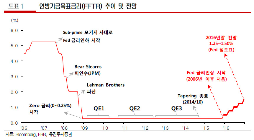 박석현 유진투자증권 연구위원은 "미국중앙은행(FED)이 0~0.25%에서 0.25~0.5%로 첫 금리인상을 결정하면서 향후 정책기조 온건성 유지와 금리인상 속도에 있어 점진성을 명확히 했다"고 평가했다. 이어 "FED는 논쟁 요인제거와 함께 미국 경제 전망에 대한 자신감과 함께 향후 금리 결정에 있어 노동시장 인플레, 금융시장 및 글로벌 여건을 고려하겠다고 밝혔다"고 설명했다.