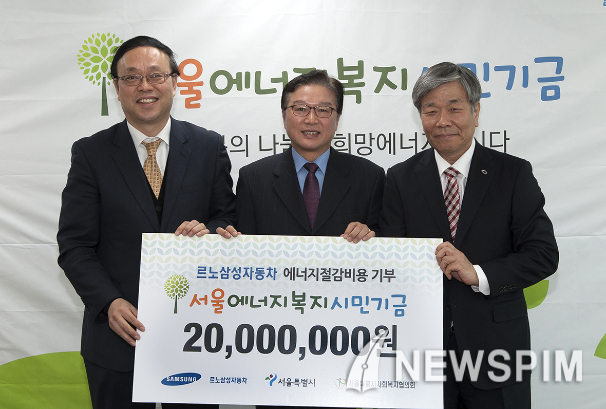| 르노삼성자동차는 부산공장에서 절약한 에너지 비용 2천만원을 서울에너지시민복지기금을 통해 에너지 빈곤층에 기부했다. 왼쪽부터 오직렬 르노삼성차 부사장, 유종국 서울시 사회복지협의회 부회장, 유재룡 서울시 기후환경본부장.<사진=르노삼성차> |