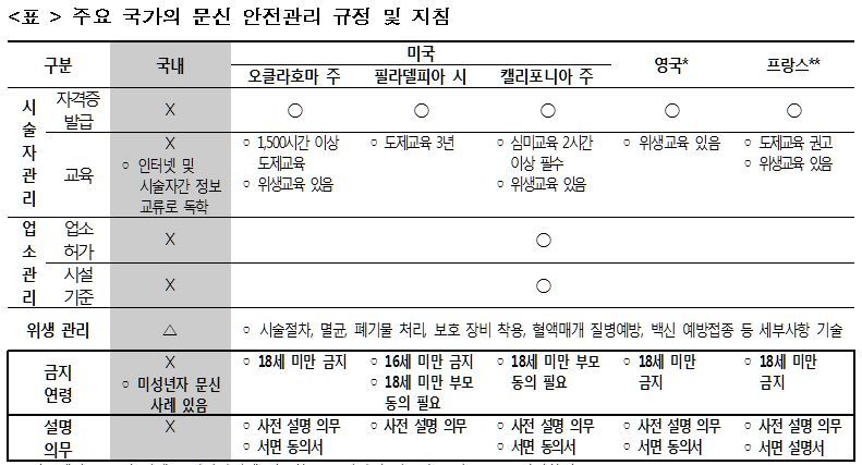 주요 국가에서는 이러한 특성에 따라 ▲미성년자 문신 금지 ▲시술 전 정보 고지 ▲이용자 사전 동의 ▲시술자 교육 ▲문신 업소 관리 ▲위생 관리 ▲염료 관리 등을 수행하고 있다.