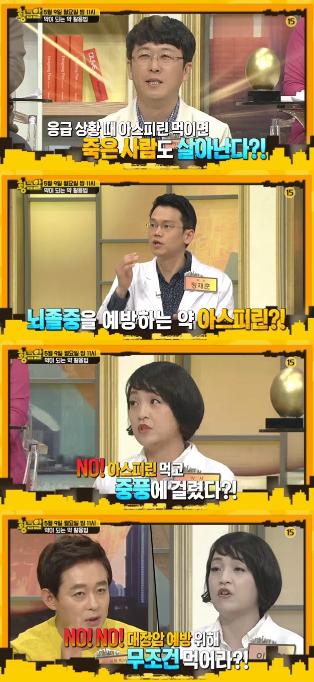 약사 정재훈은 "아스피린이 뇌졸중이 생기는 걸 예방하는데 도움이 된다"고 말했다. 반면 약사 이지향은 "그렇게 생각하지 않는다"며 "아스피린을 먹은 50대, 오히려 중풍 증가가 있다"고 반박했다.