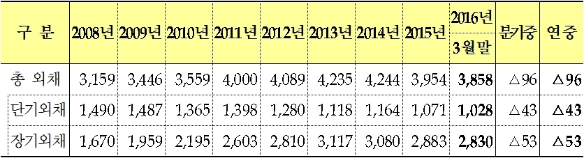 단기외채(계약만기 1년 이하)가 1028억달러로 43억달러 줄었고, 장기외채(계약만기 1년 초과)는 2830억불로 53억달러 감소했다.