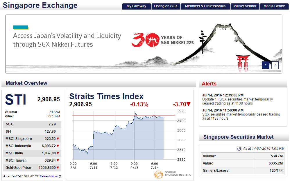 | 14일 싱가포르거래소(SGX)는 오전 11시38분부터 전체 주식거래를 일시 중단한다고 발표했다. <사진=SGX 홈페이지> |