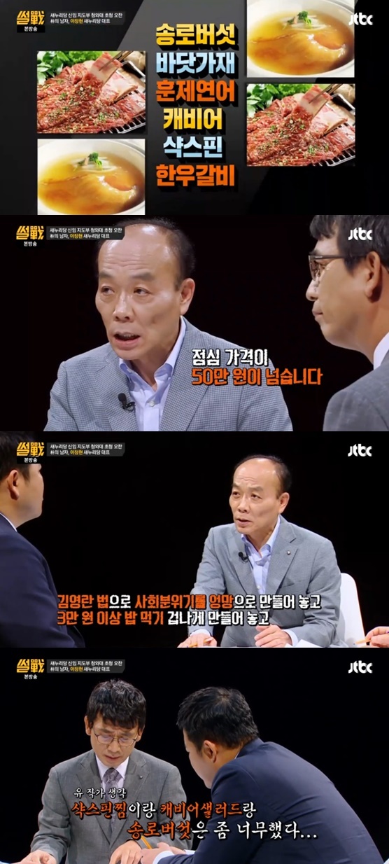이날 전원책은 “오찬 메뉴가 송로버섯, 바닷가재, 훈제연어, 캐비어, 샥스핀, 한우갈비. 일반 서민들은 평생에 한 번 이 한 종목을 먹을까 말까 하는 것들이다”라며 문제점을 제기했다.