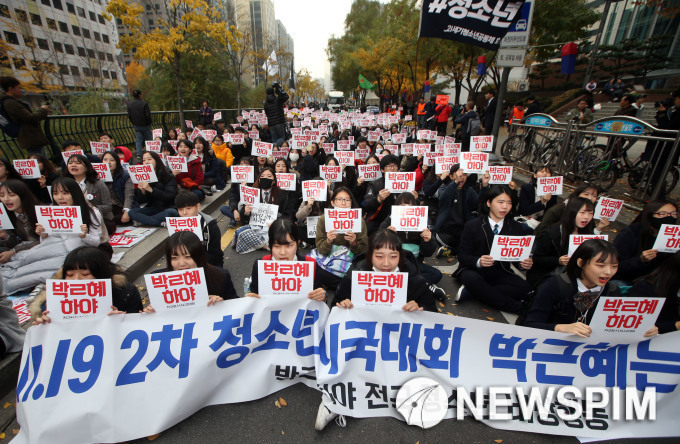 | '21세기청소년공동체 희망' 소속 학생들이 19일 오후 서울 종각역 인근에서 집회를 열고 박근혜 대통령의 퇴진을 촉구하고 있다. <사진=김학선 사진기자> |