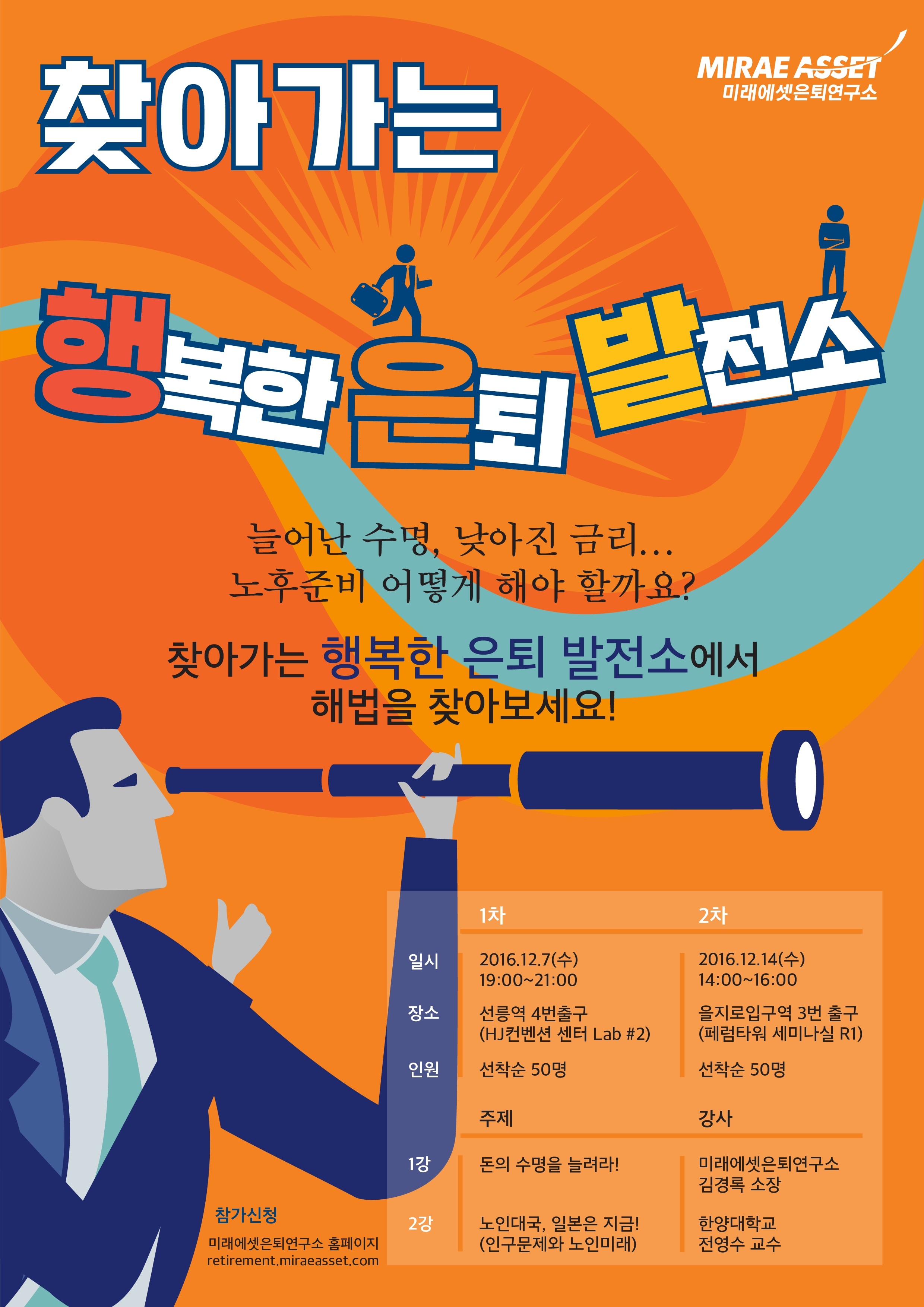 [뉴스핌=김지완 기자] 미래에셋은퇴연구소는 은퇴 세미나인 ‘찾아가는 행복한 은퇴발전소’를 오는 12월7일과 14일에 개최한다.