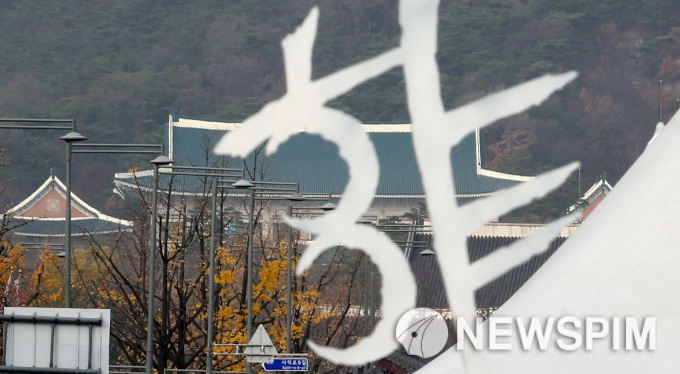 [뉴스핌=김학선 기자] 검찰이 '국정농단'의 핵심인물 최순실 씨 등 3명을 기소하면서 박근혜 대통령이 이들과 공모관계라고 밝힌 가운데 21일 오후 서울 광화문광장에 설치된 '하야' 피켓 뒤로 청와대가 보이고 있다.