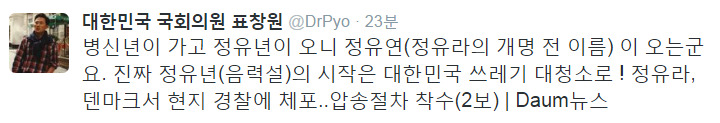 표창원 의원은 2일 자신의 트위터에 "병신년이 가고 정유년이 오니 정유연(정유라의 개명 전 이름)이 오는군요. 진짜 정유년(음력설)의 시작은 대한민국 쓰레기 대청소로!"라고 전했다.