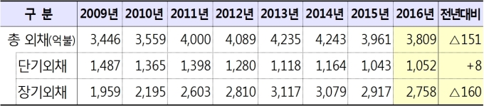 [세종=뉴스핌 정경환 기자] 기획재정부는 2016년 말 기준 우리나라의 총 외채가 3809억달러로 전년 대비 151억달러 줄었다고 22일 밝혔다.
