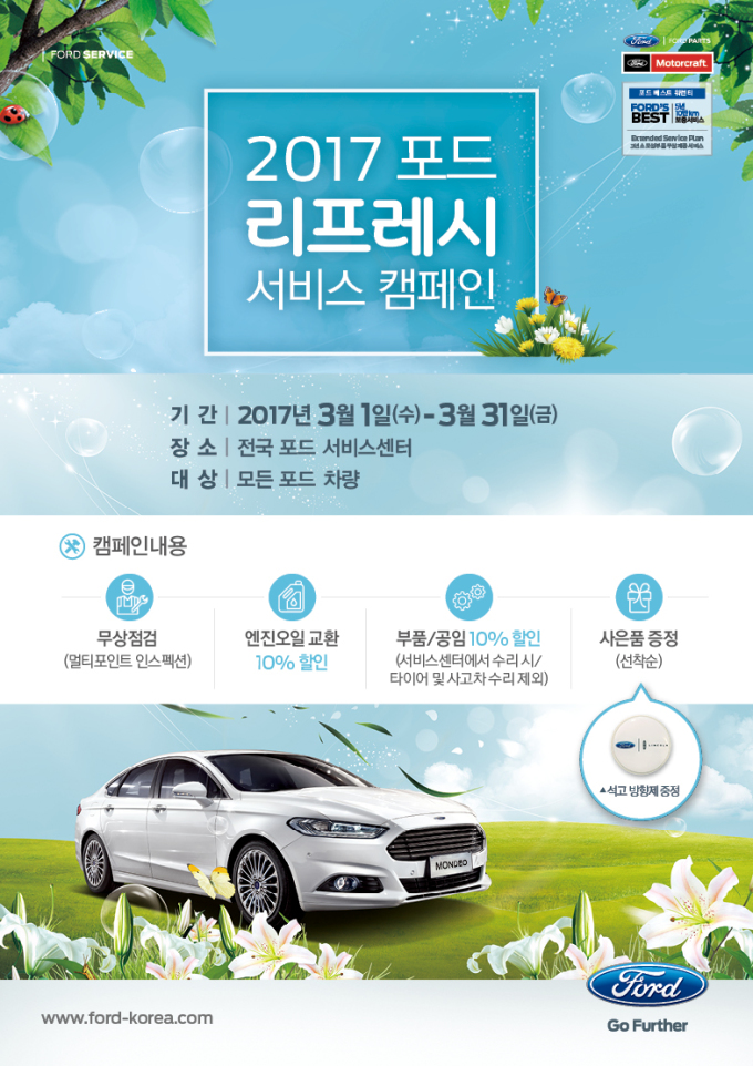 [뉴스핌=전민준 기자] 포드코리아(대표이사 정재희)가 3월 한 달간 무상점검 및 수리비를 할인하는 '리프레시 캠페인'을 진행한다.