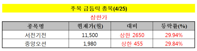 한편 서전기전(29.94%) 역시 함께 상한가리스트에 이름을 올렸다.
