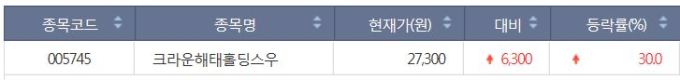 유가증권시장에서 크라운해태홀딩스 우선주는 지주사 요건 충족 소식에 상한가로 거래를 마감했다. 크라운해태홀딩스는 전날 장 마감 후 공정거래위원회로부터 지주회사 기준요건을 충족하고 있음을 통보받았다고 공시했다.