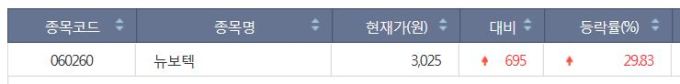 코스닥시장에서 뉴보텍은 한거희 대표이사가 더불어민주당 선대위 중소기업특별위원회에 참여하고 있다는 소식이 알려지며 상한가로 마감했다.