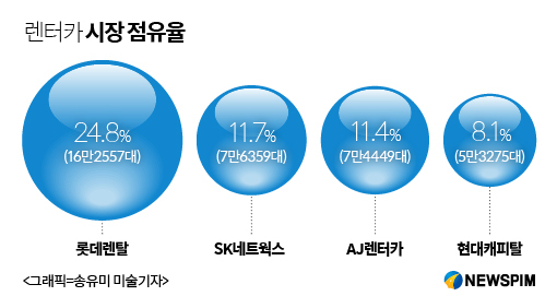 [ 뉴스핌=전선형 한기진 기자 ] 렌터카 시장이 급성장하고 있다. 젊은 세대와 고소득 개인사업자를 중심으로 렌터카 이용이 빠르게 늘어나고 있다. 이용객이 늘면서 판매회사들의 경쟁도 치열해졌다. 오랜 업력으로 전국 곳곳에 직영망을 갖춘 롯데렌탈(롯데렌터카)과 주유소와 차량정비 센터를 보유한 신흥강자 SK네트웍스(SK렌터카)가 각축중이다.